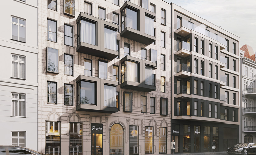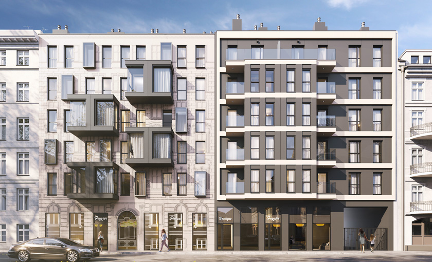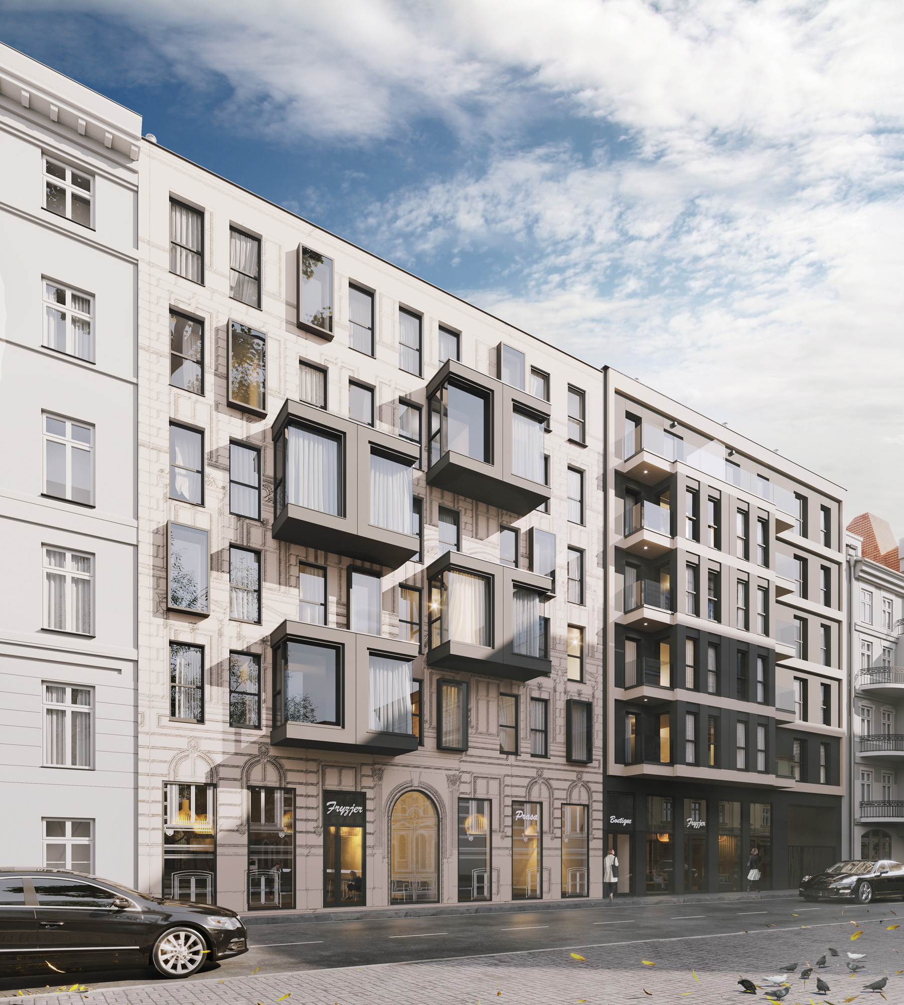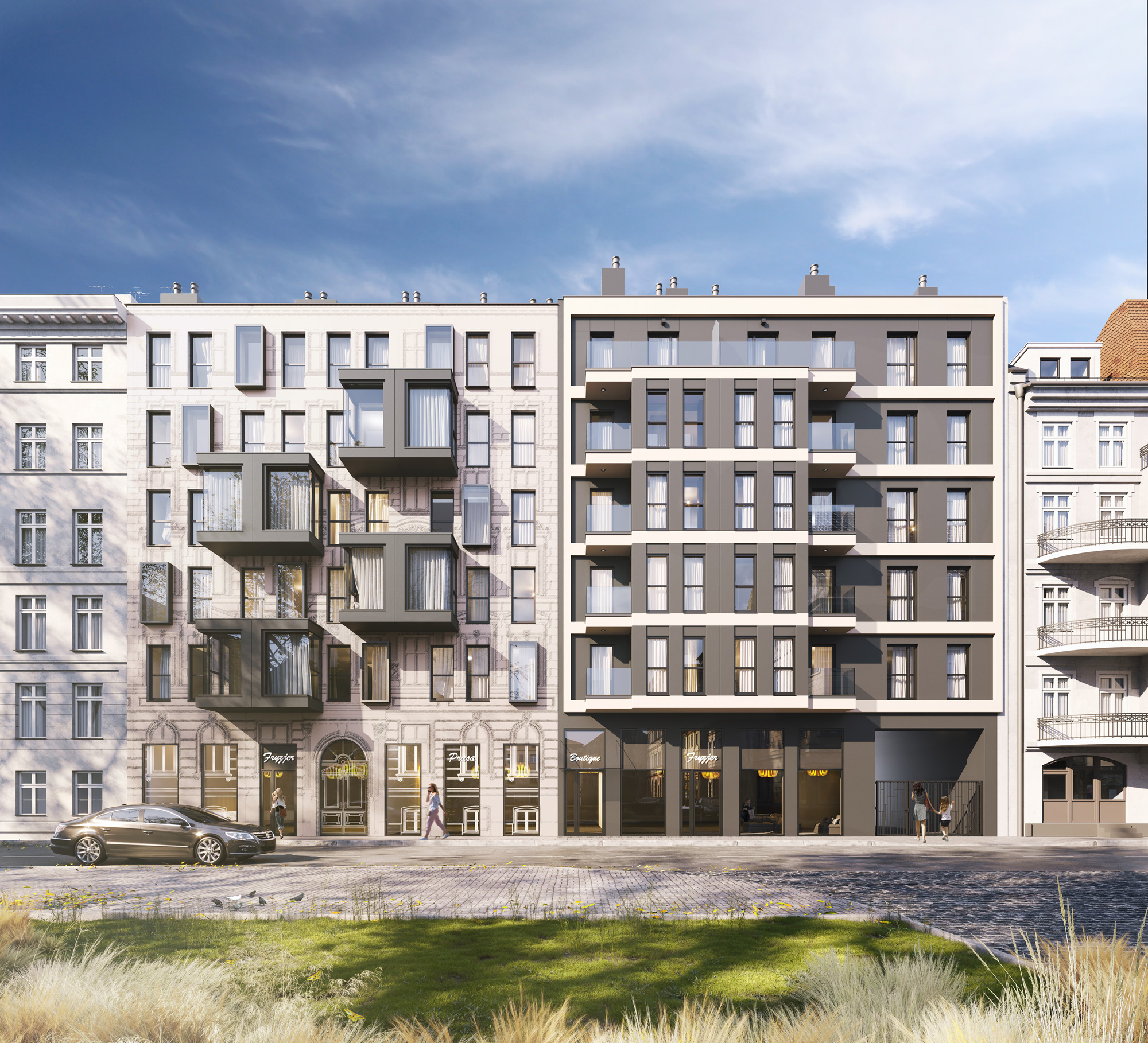 - Budynek mieszkalny wielorodzinny, stojący w zwartej, śródmiejskiej pierzei. Jego elewacja podzielona optycznie na dwie części nawiązuje do istniejącej tam wcześniej kamienicy.