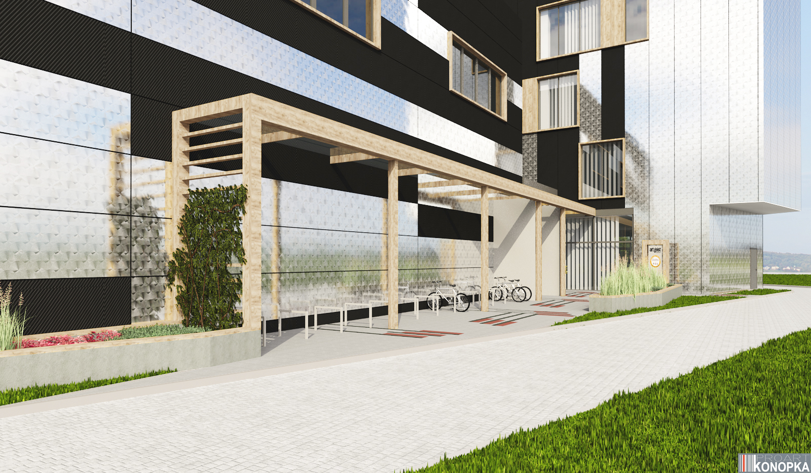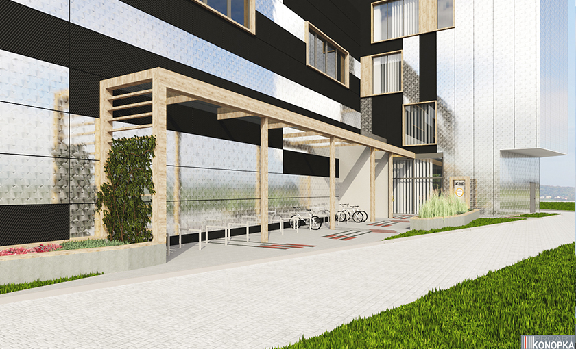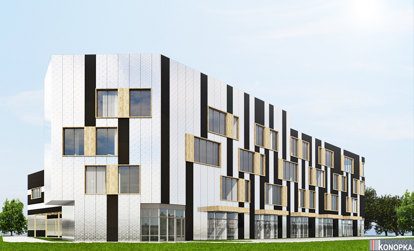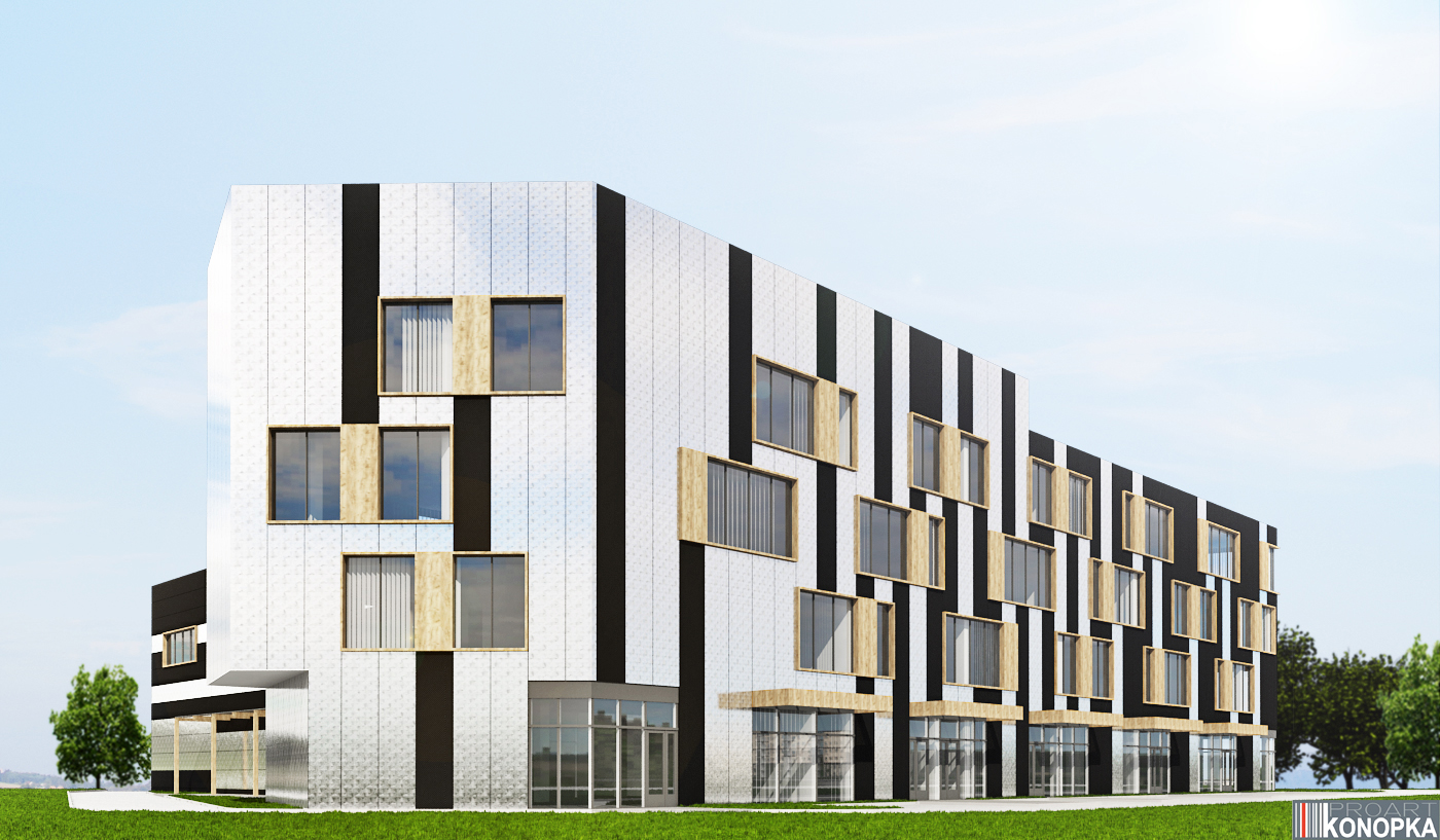 Elewacja z płyt warstwowych wykończonych dwoma rodzajami okładziny oraz wstawkami imitującymi drewno.