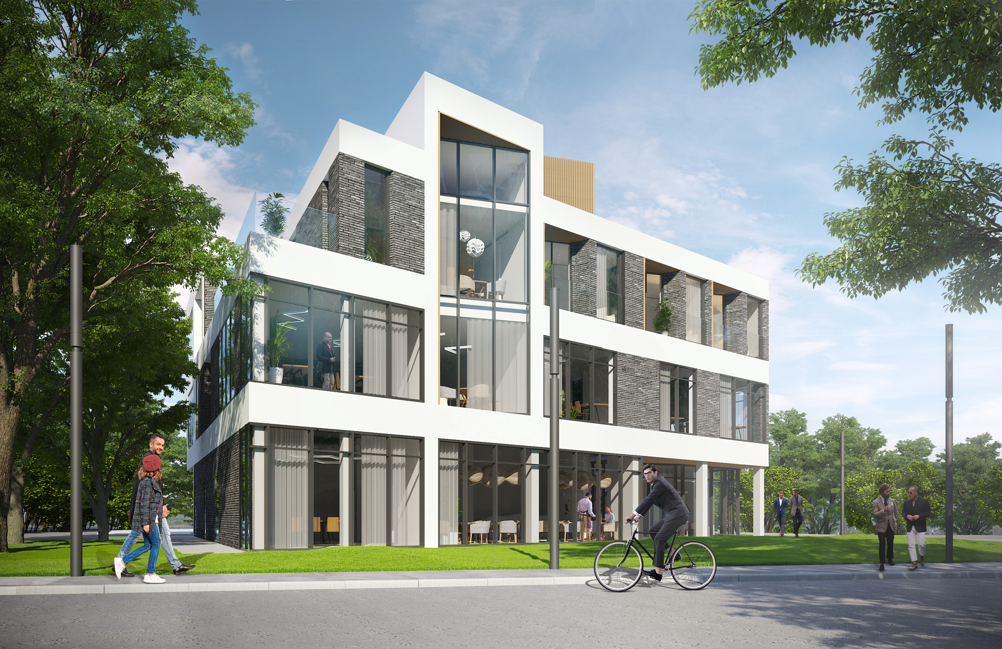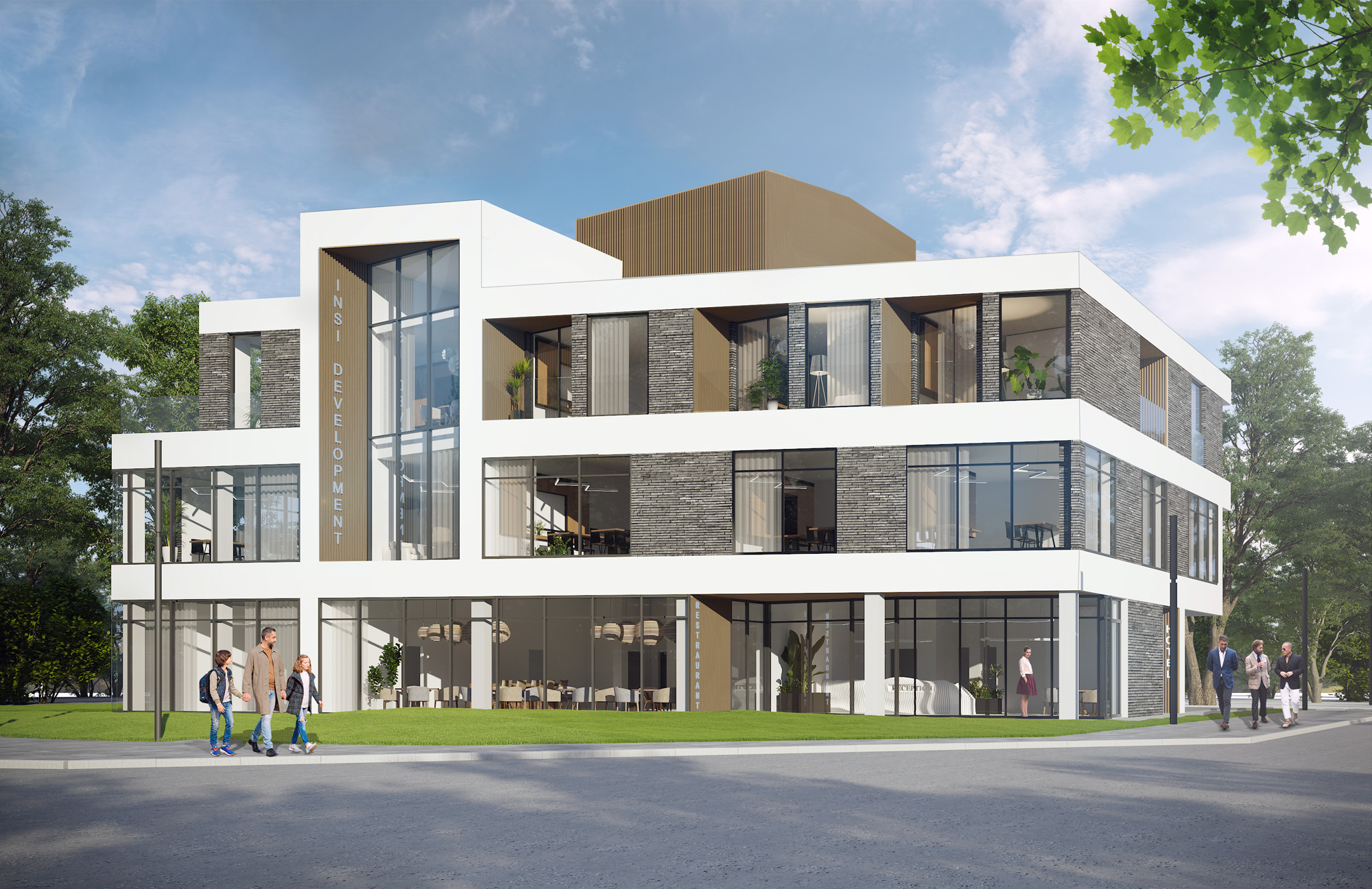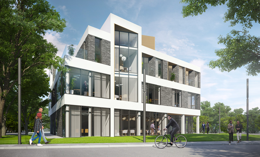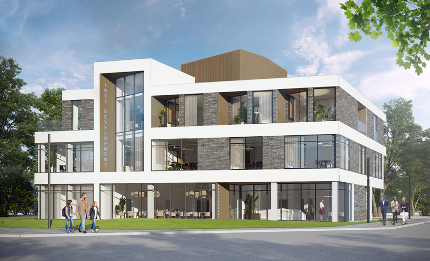 - Trzykondygnacyjny, wolnostojący budynek z usługami na parterze i pierwszym piętrze.