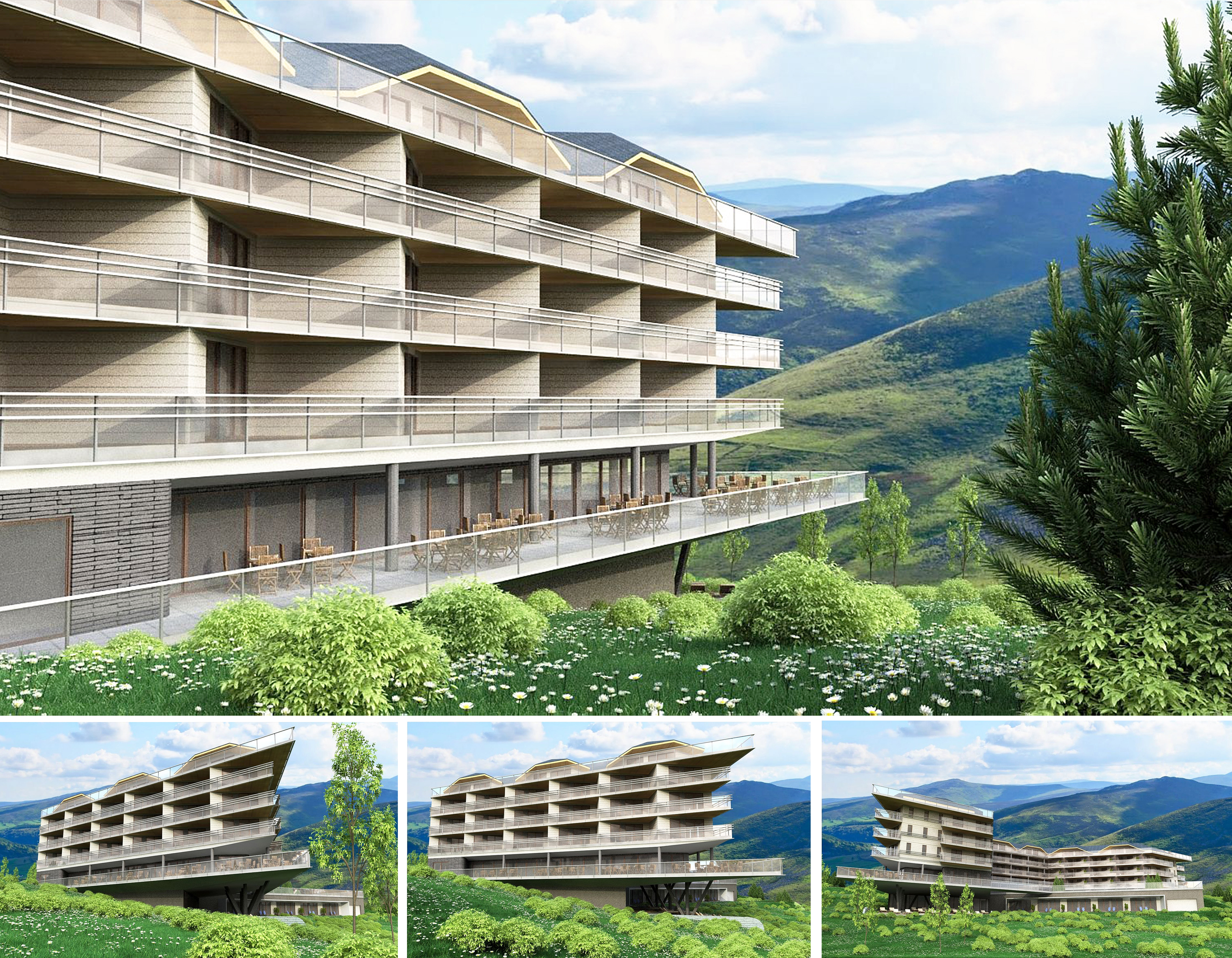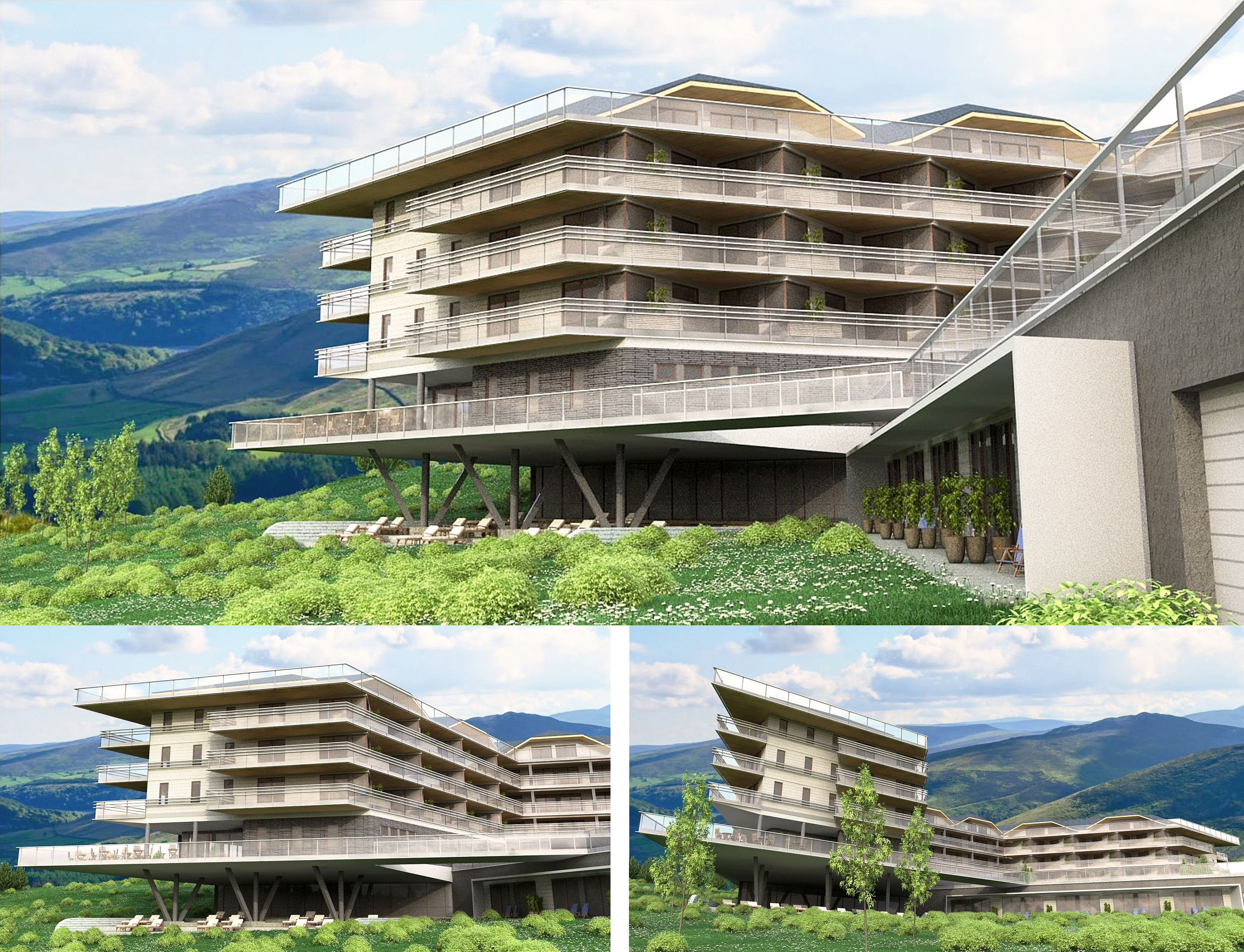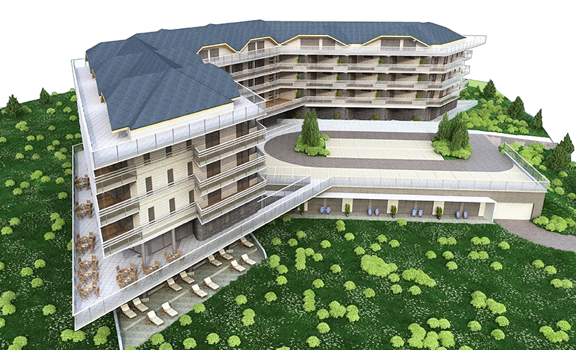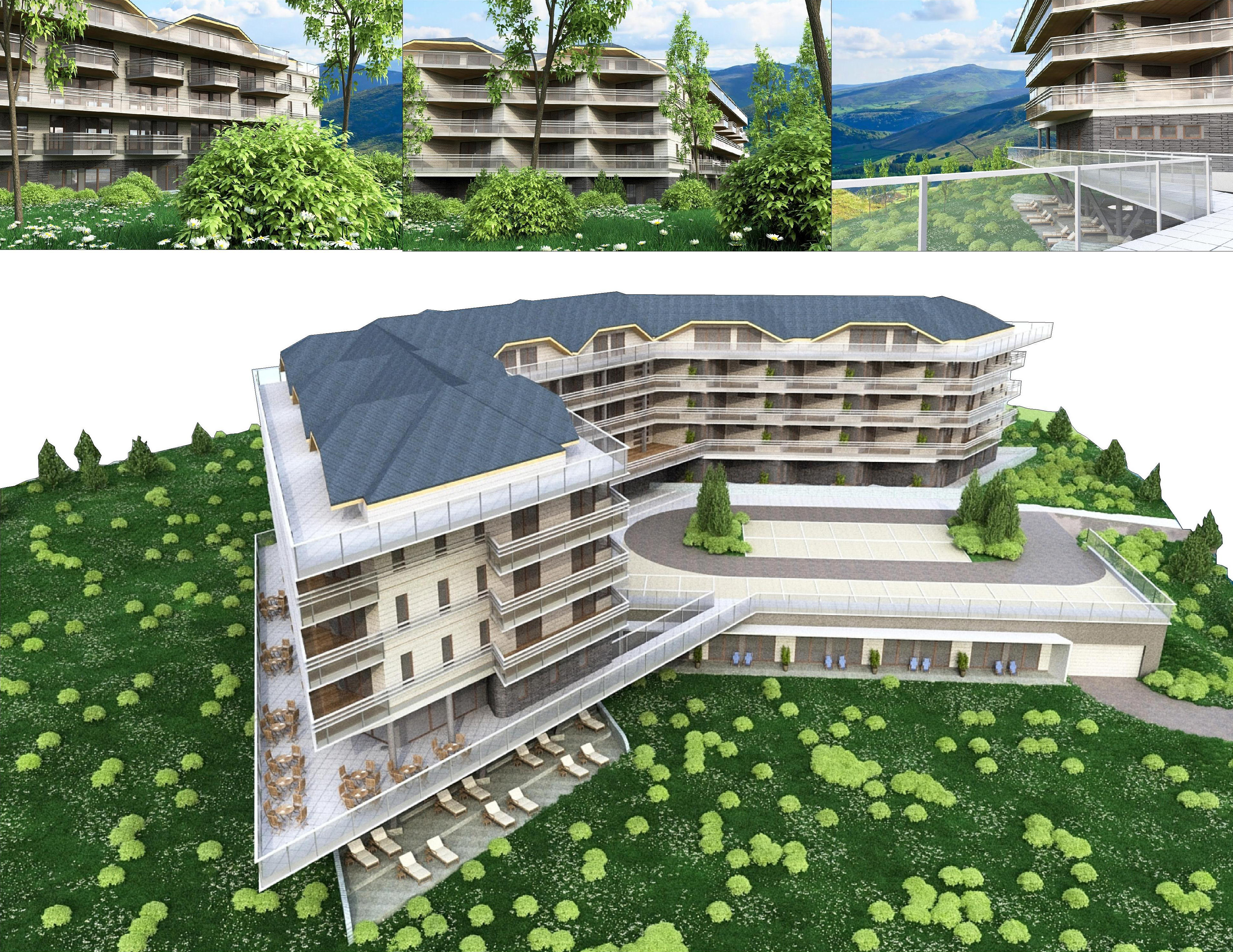 Koncepcja hotelu z restauracją, basenem i SPA w przyziemiu.