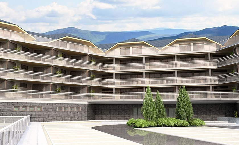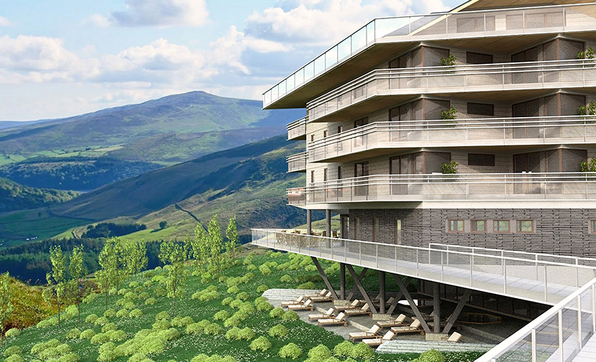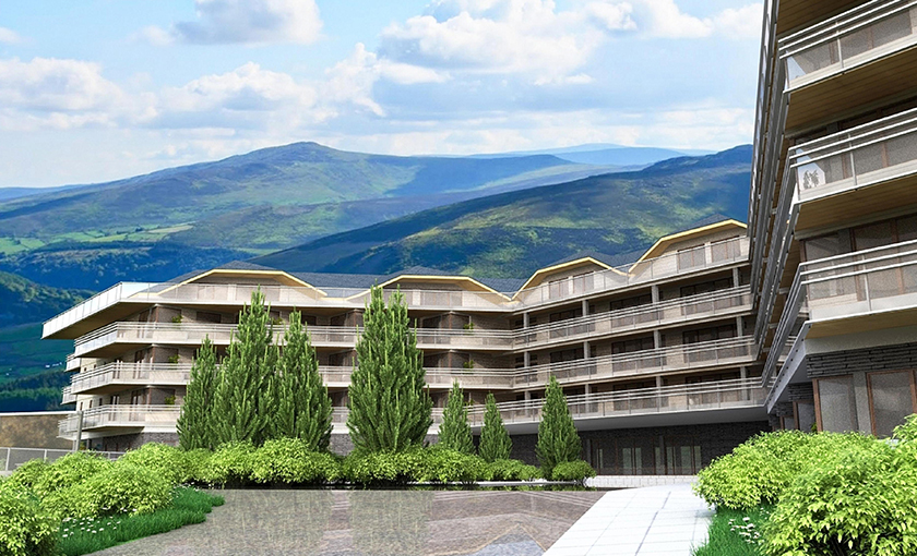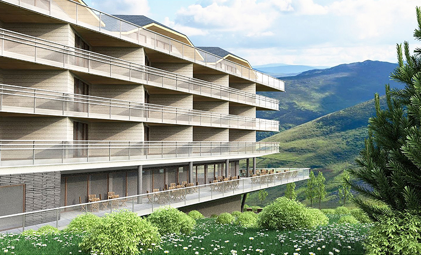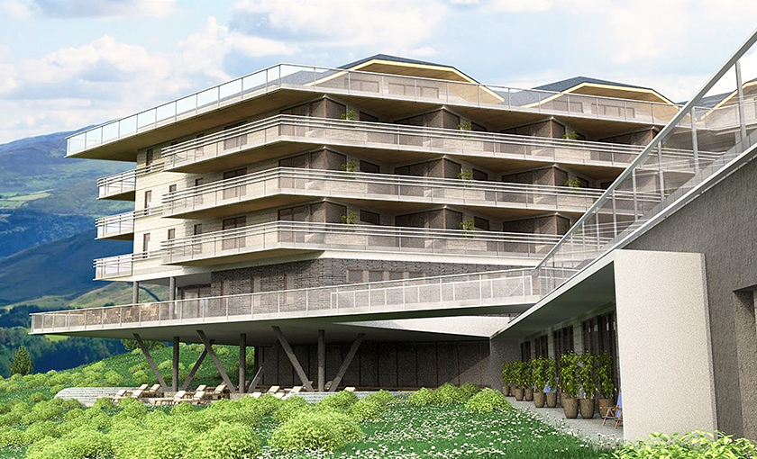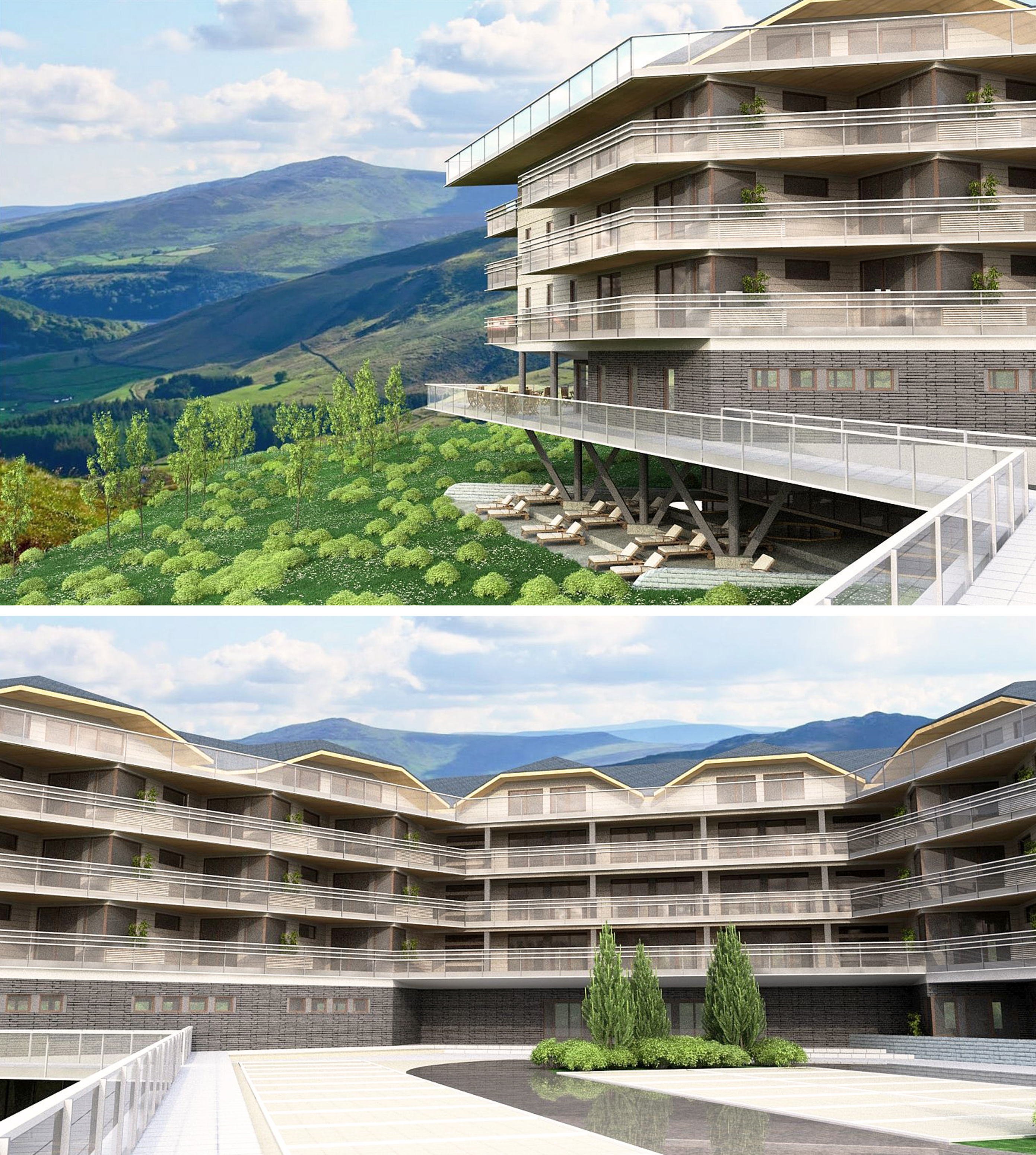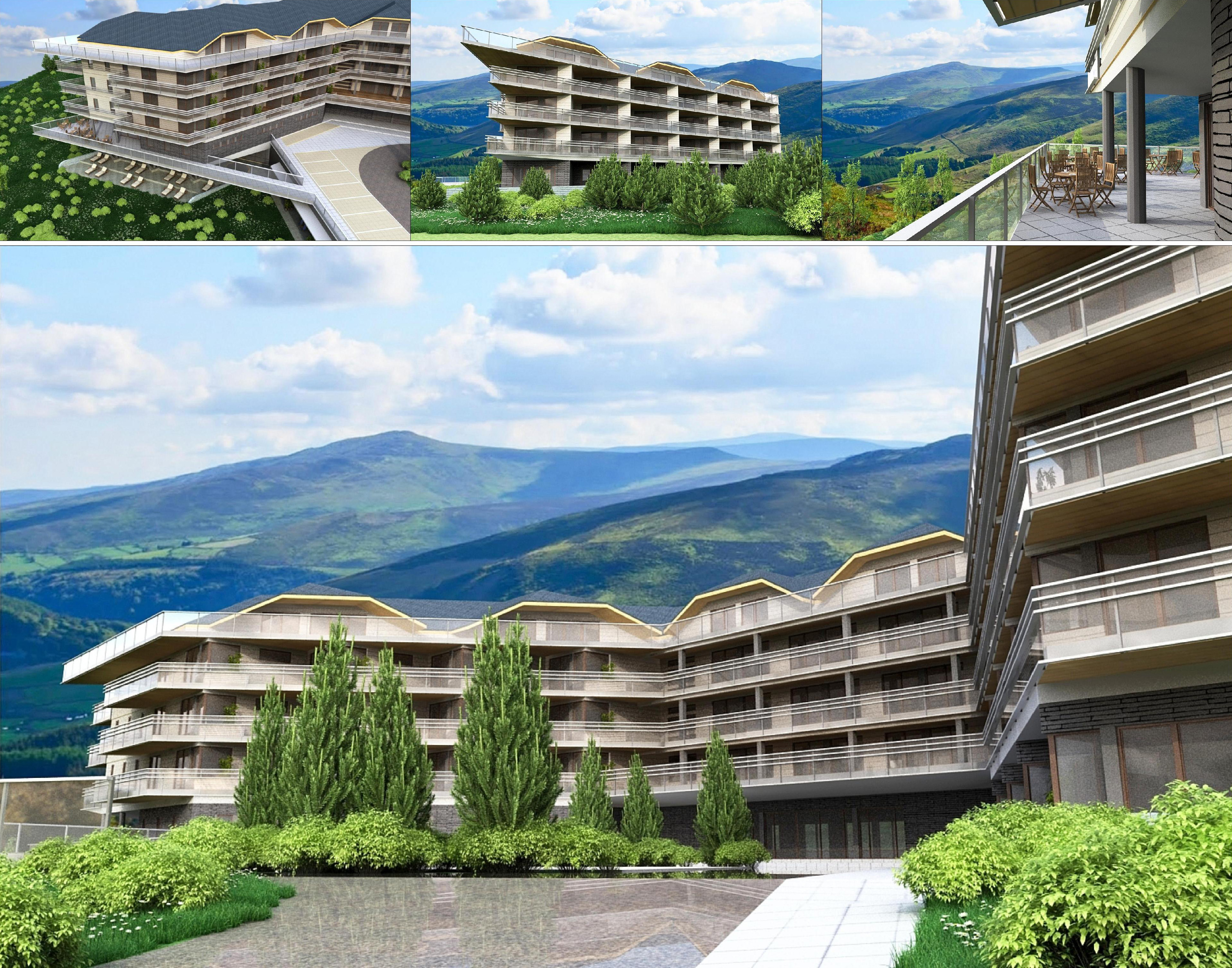 Koncepcja hotelu z restauracją, basenem i SPA w przyziemiu.